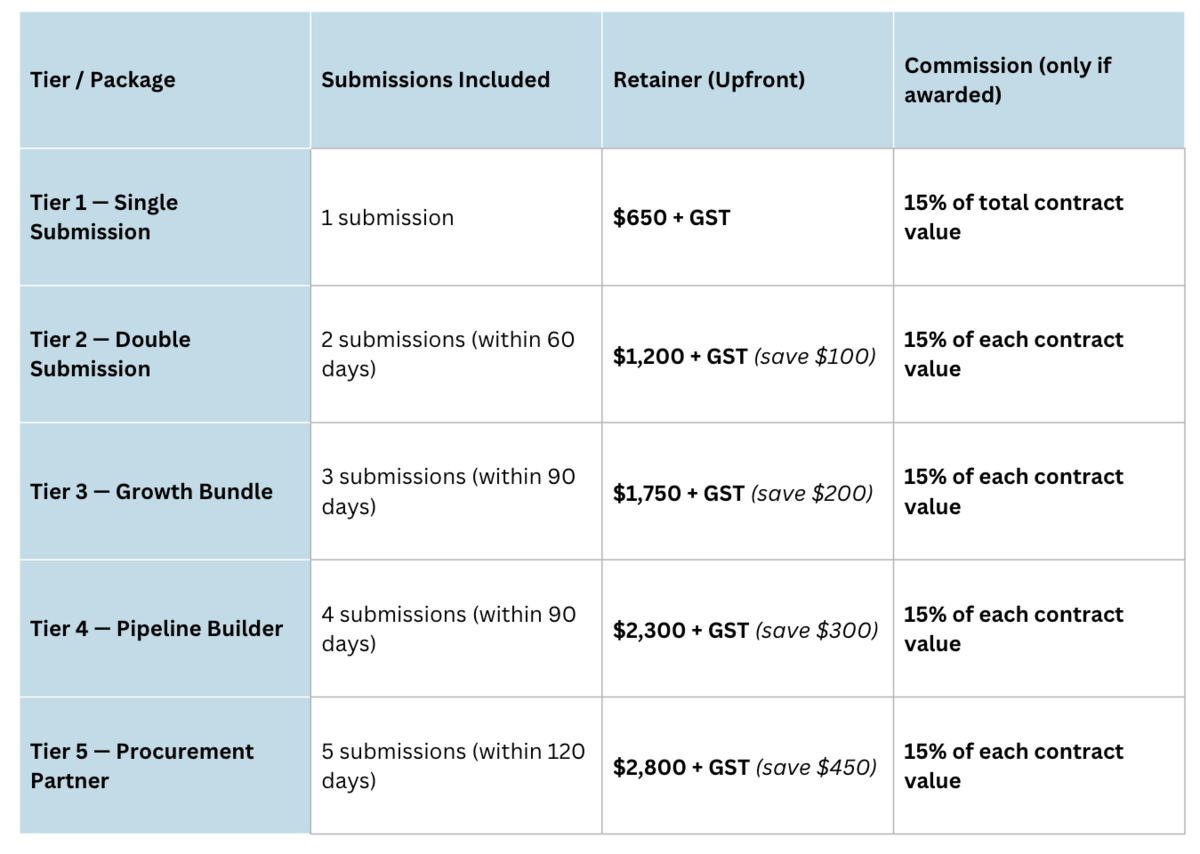 I use a simple and fair pricing structure based on the number of submissions you’d like completed. Each submission = one tender / RFQ / quote preparation and lodgement.